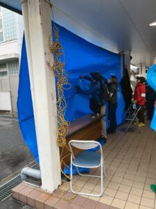 訓練当日はあいにくの寒い雨。体育館の軒下を利用し、スターターキットにあるブルーシートやロープで風よけを設営しました。キットの内容は簡易的な雨風をしのぐ程度のもので、市の予算を考えてもケージの備え付けまでは難しいのが現状です。